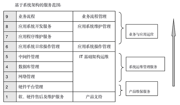 IT服务体系并不是一蹴而就的,而是随着IT技术与系统的发展而完善。早期简单的IT应用环境,可以容忍相对简陋混乱的IT服务管理。由于IT结构日渐复杂,客户使用的IT产品与厂商日益增多,要求统一的IT服务管理,对故障进行响应与修复。随着IT系统对企业运营重要性的不断提高,企业愈来愈难以容忍I系统故障和宕机,此时需要主动积极的IT服务管理。IT系统已经成为企业运作的基石,不停顿运行(7*24365)已成为IT系统的基本要求,同时现代企业不断拓展的新业务需求越发频密,相适应地,要求随需应变的IT服务管理。最终,服务的目标是实现I系统与企业业务的无缝结合,并成为企业业务发展的推动力,能够极大促进企业价值增长,成为企业的一项重要财富。